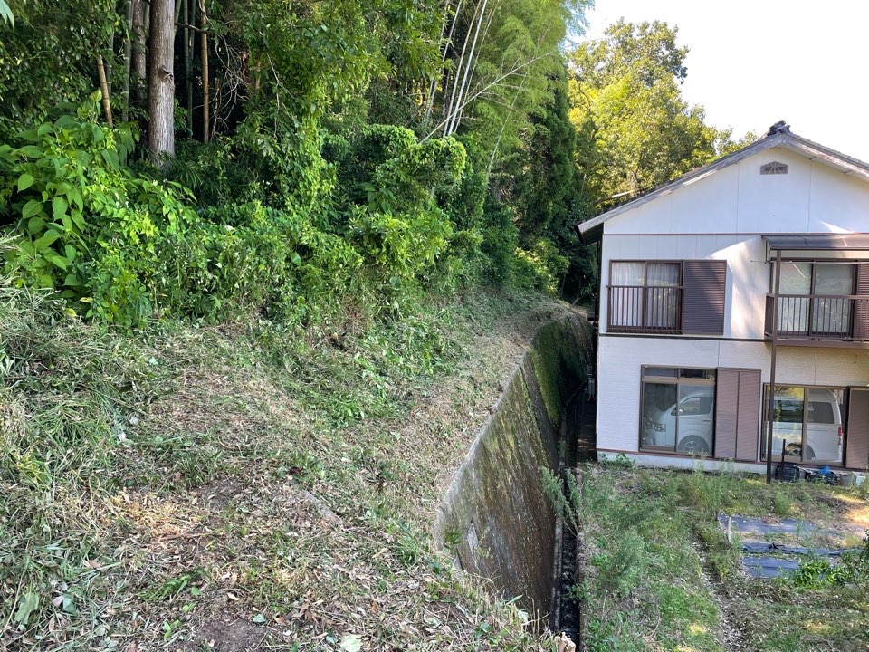 擁壁下は敷地外ですのでしっかり掃除までしております。また、刈った草が落ちないよう法肩の方まで草を持ち上げています。